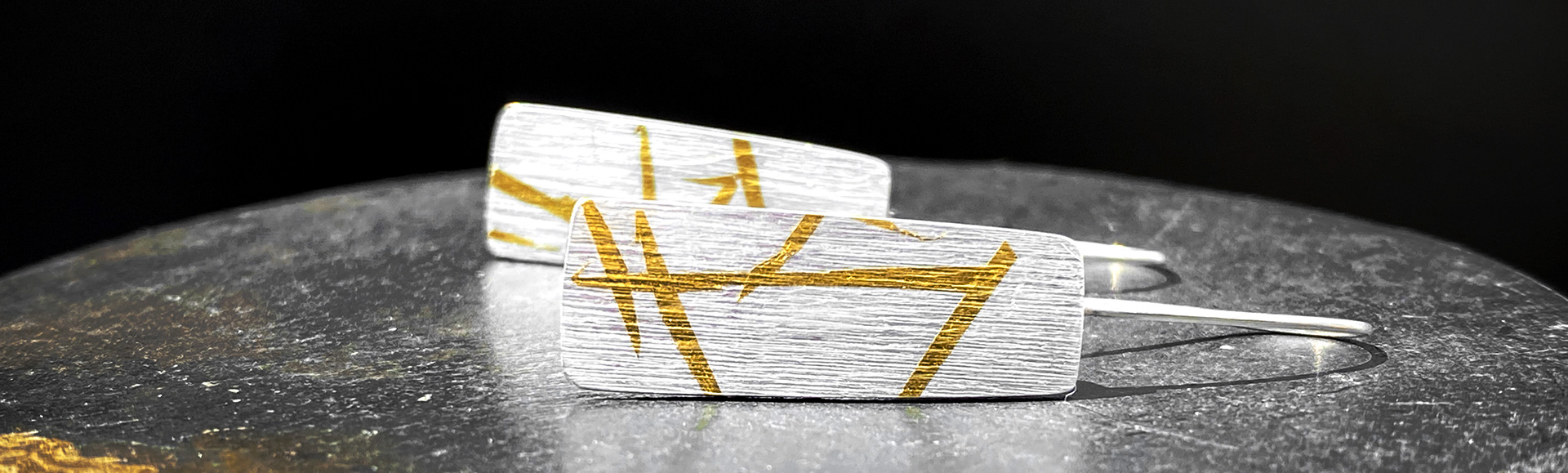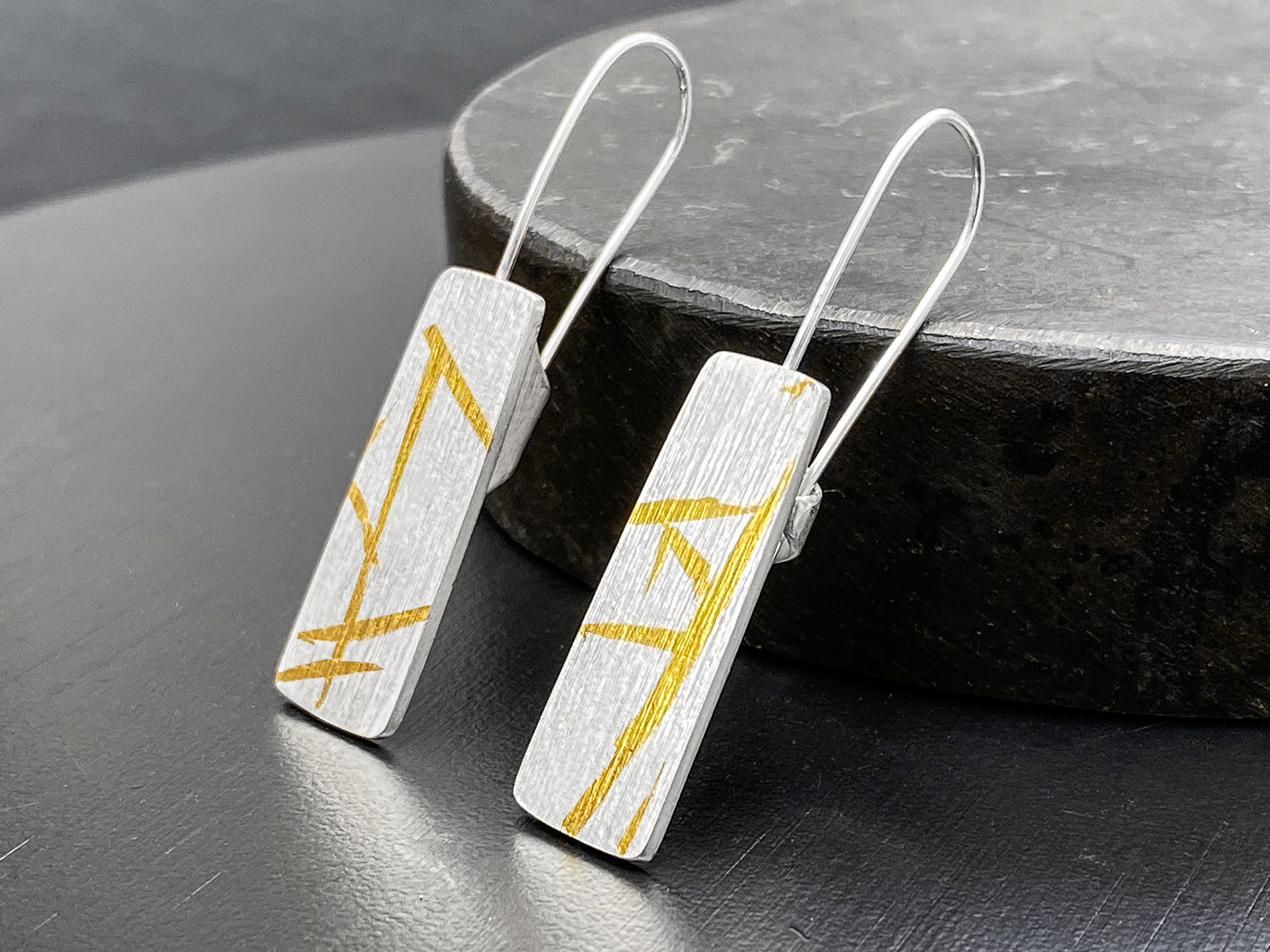 Calligraphic brushstrokes in gold on hand embossed falling rain pattern sterling silver tablets. Safety pin style earwire catches at back.