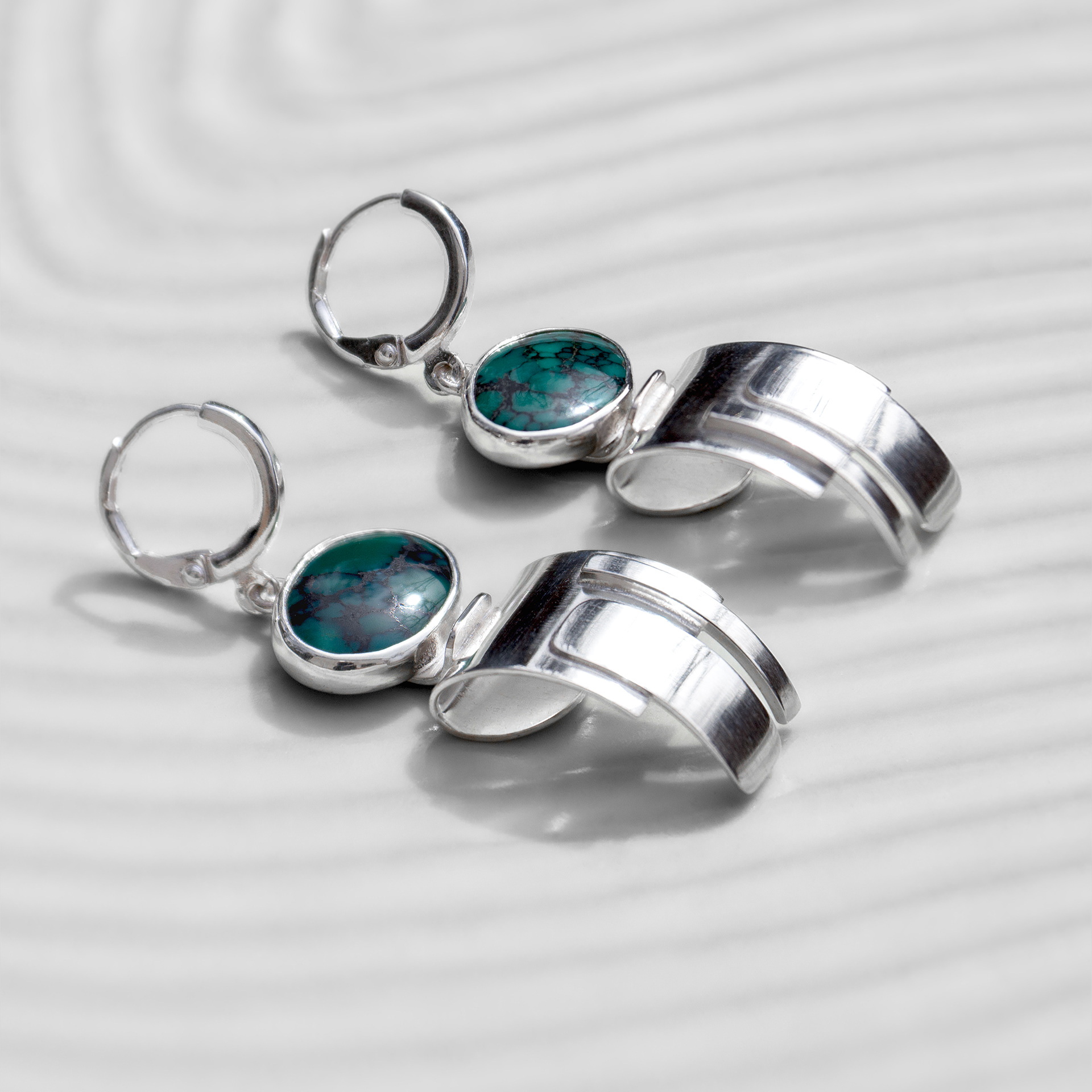 A gorgeous structural compilation of sterling silver, reminiscent of native pacific northwest formline design, crowned with natural old stock Hubei turquoise cabochons.
