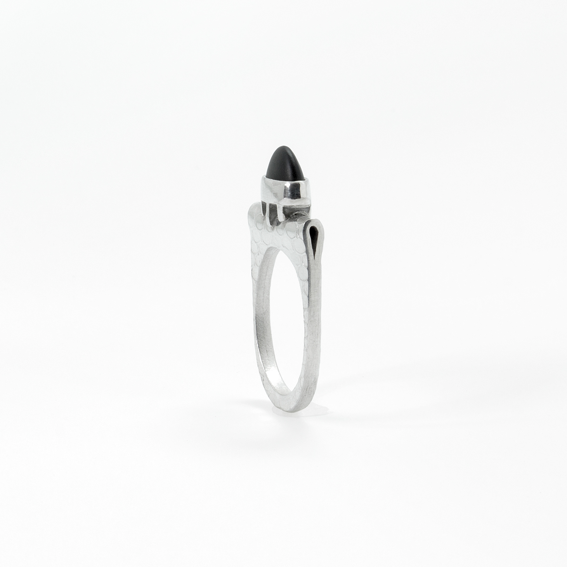 Hand embossed sterling silver in a repeating oval pattern forms the shank. Resting on a platform above sits a bezel set extreme high dome matte black onyx cabochon. Mid-Mod meets Japan in a size 7.5 ring.